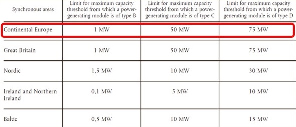 RfG divides the modules according to electricity generation technologies on: synchronous power-generating module - frequency of the generated voltage, the generator speed and the frequency of network voltage are in a constant ratio and thus in synchronism, and power park module: - non-synchronously connected to the network or connected through power electronics. The same document divides the modules according to maximum capacity and the voltage level at the connection point on: type A, type B, type C and type D. For the voltage levels less than 110 kV power-generating modules can be type A, type B, type C or type D, depending on its the maximum capacity, while for the voltage levels greater or equal to 110 kV the modules are type D. For modules of maximum capacity less than 0.8 kW no categorization is done. The limits for maximum capacity threshold (Fig.1) for which a power-generating module is type B, type C and type D, are: 1 MW, 50 MW and 75 MW, respectively (note that maximum capacity thresholds are proposed by the relevant TSO, and approved by the relevant regulatory authority or state).